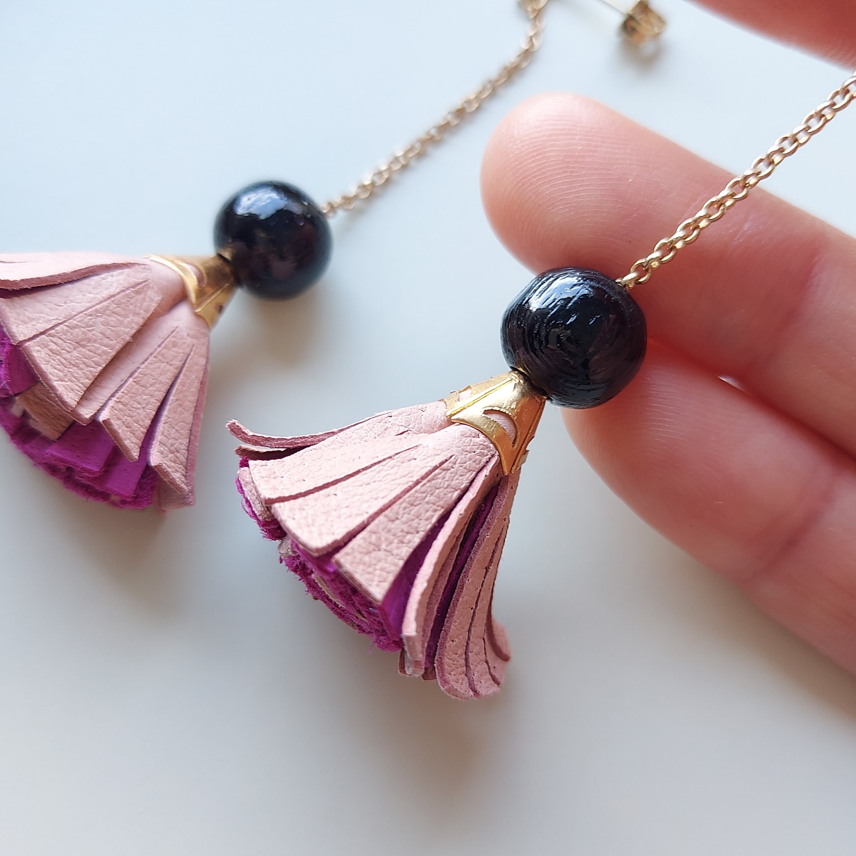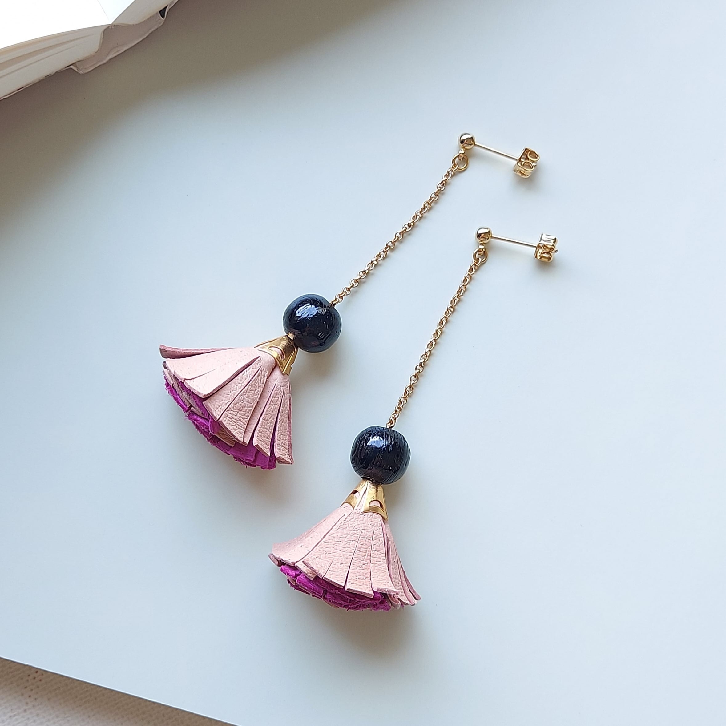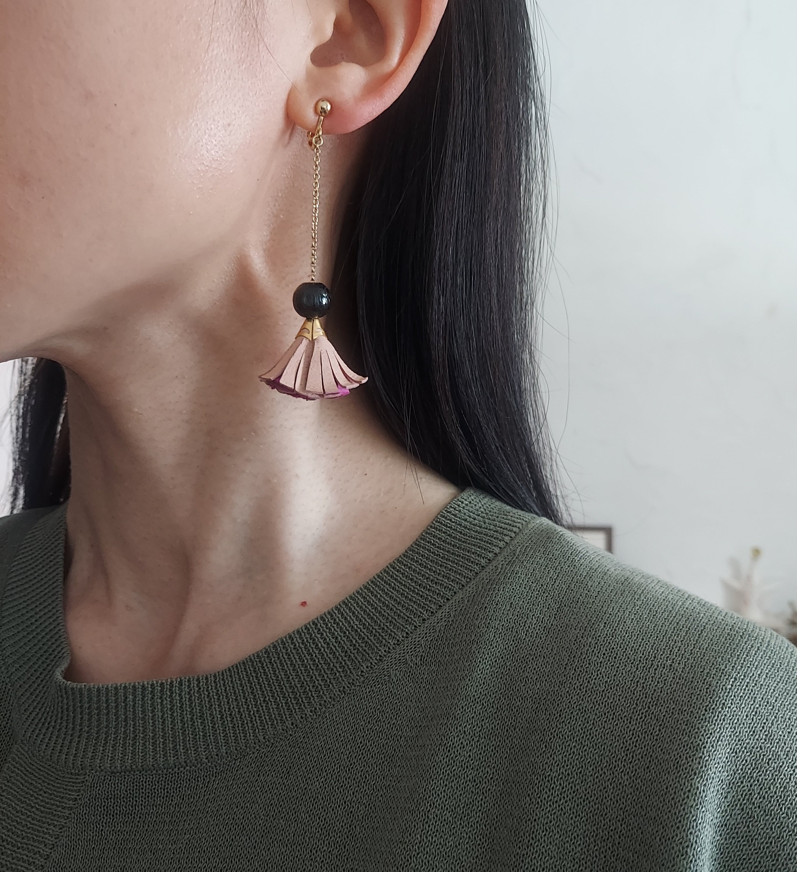 豚革を使用したオリジナルタッセルをアレンジ。黒パーツはウッドビーズを使用。全体に軽い素材を使っています。