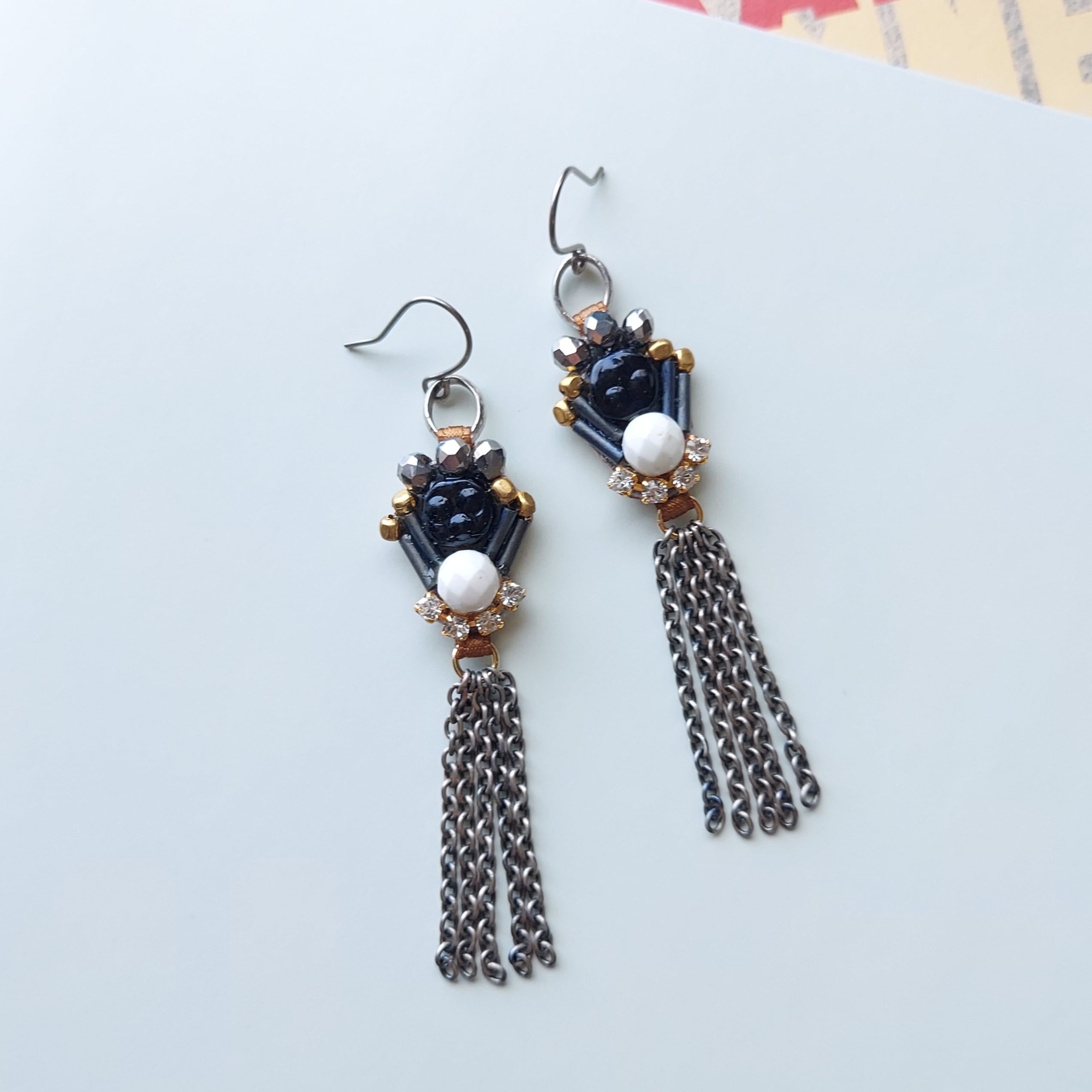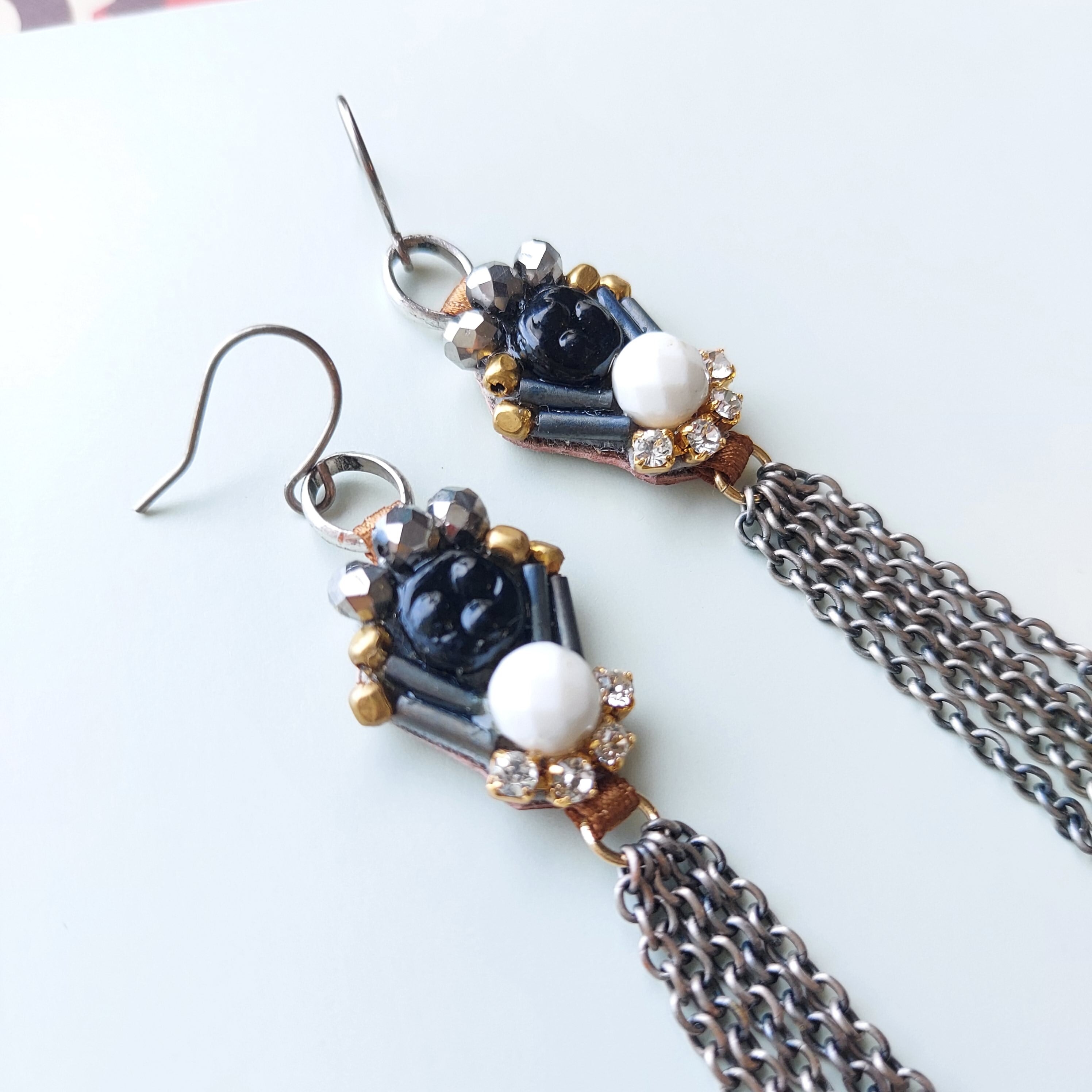 プチフールシリーズから、一部パーツの破損によりデザイン変更しました。ヨーロッパのデッドストックガラスビーズ(黒)、天然石、ラインストーンなどプチフールらしい素材が詰まっています。かっこよくモードな雰囲気が好きな方へ。